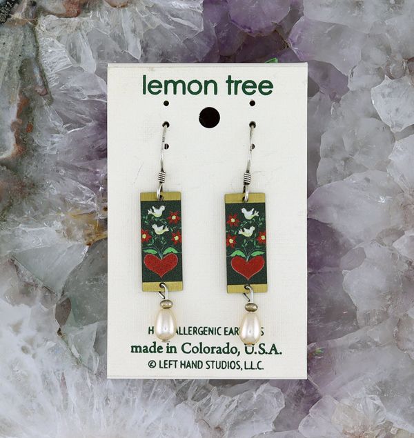 These wonderful Lemon Tree Heart and Dove earrings are handmade in the U.S.A. The silver ear-wires are sterling silver and the gold ear-wires are gold filled.