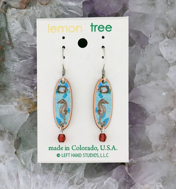 These wonderful Lemon Tree Seahorse earrings are handmade in the U.S.A. The silver ear-wires are sterling silver and the gold ear-wires are gold filled.