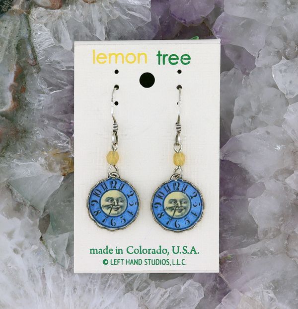 These wonderful Lemon Tree Moon in Clock earrings are handmade in the U.S.A. The silver ear-wires are sterling silver and the gold ear-wires are gold filled.
