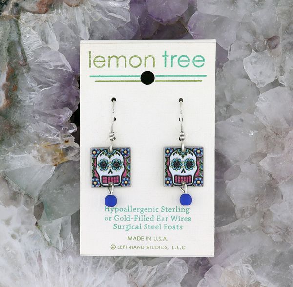 These wonderful Lemon Tree Sugar Skull earrings are handmade in the U.S.A. The silver ear-wires are sterling silver and the gold ear-wires are gold filled.
