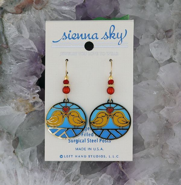 These wonderful Sienna Sky Love Birds earrings are handmade in the U.S.A. The ear-wires are either sterling silver or gold filled. Post earrings have surgical steel posts.